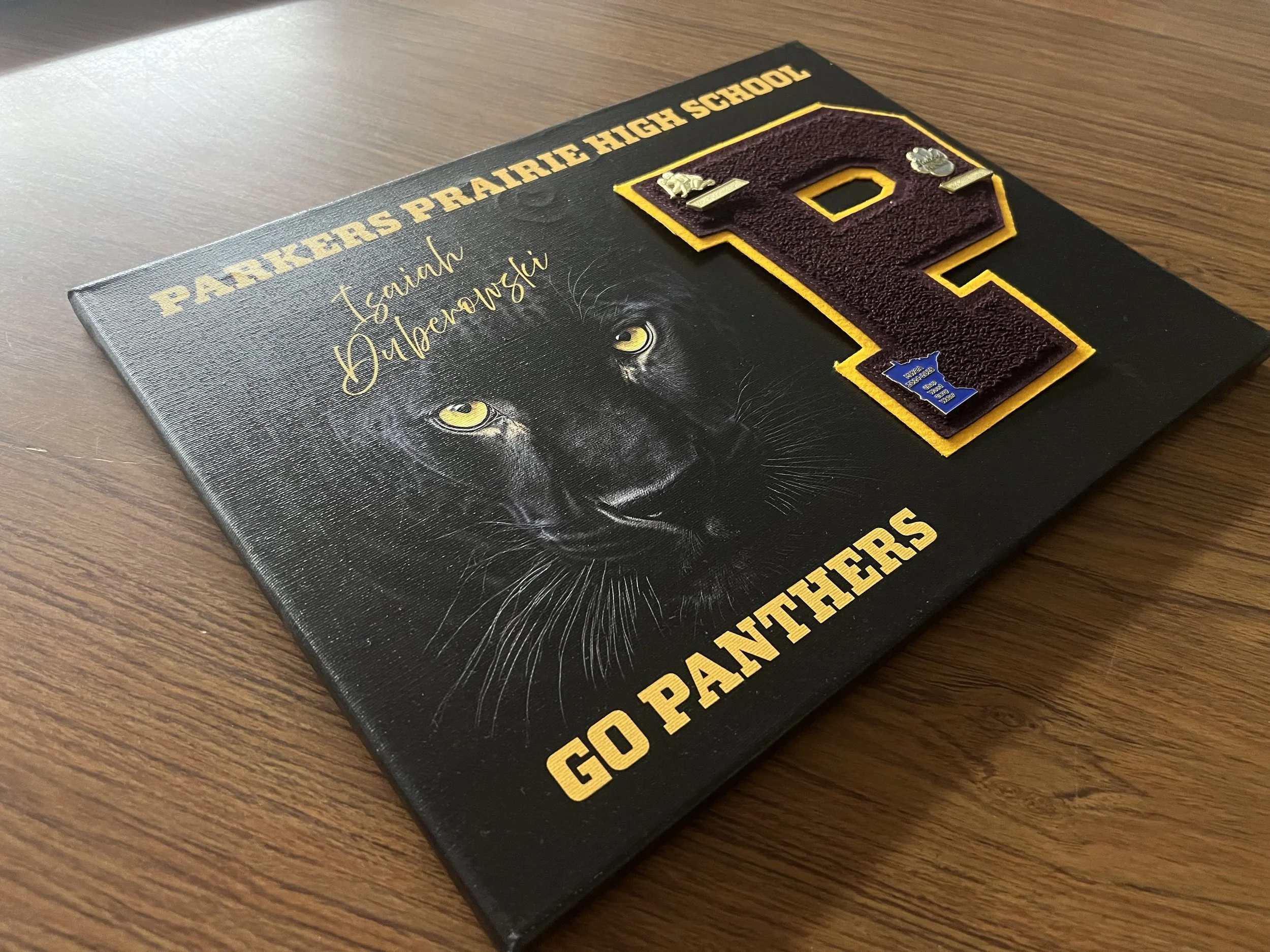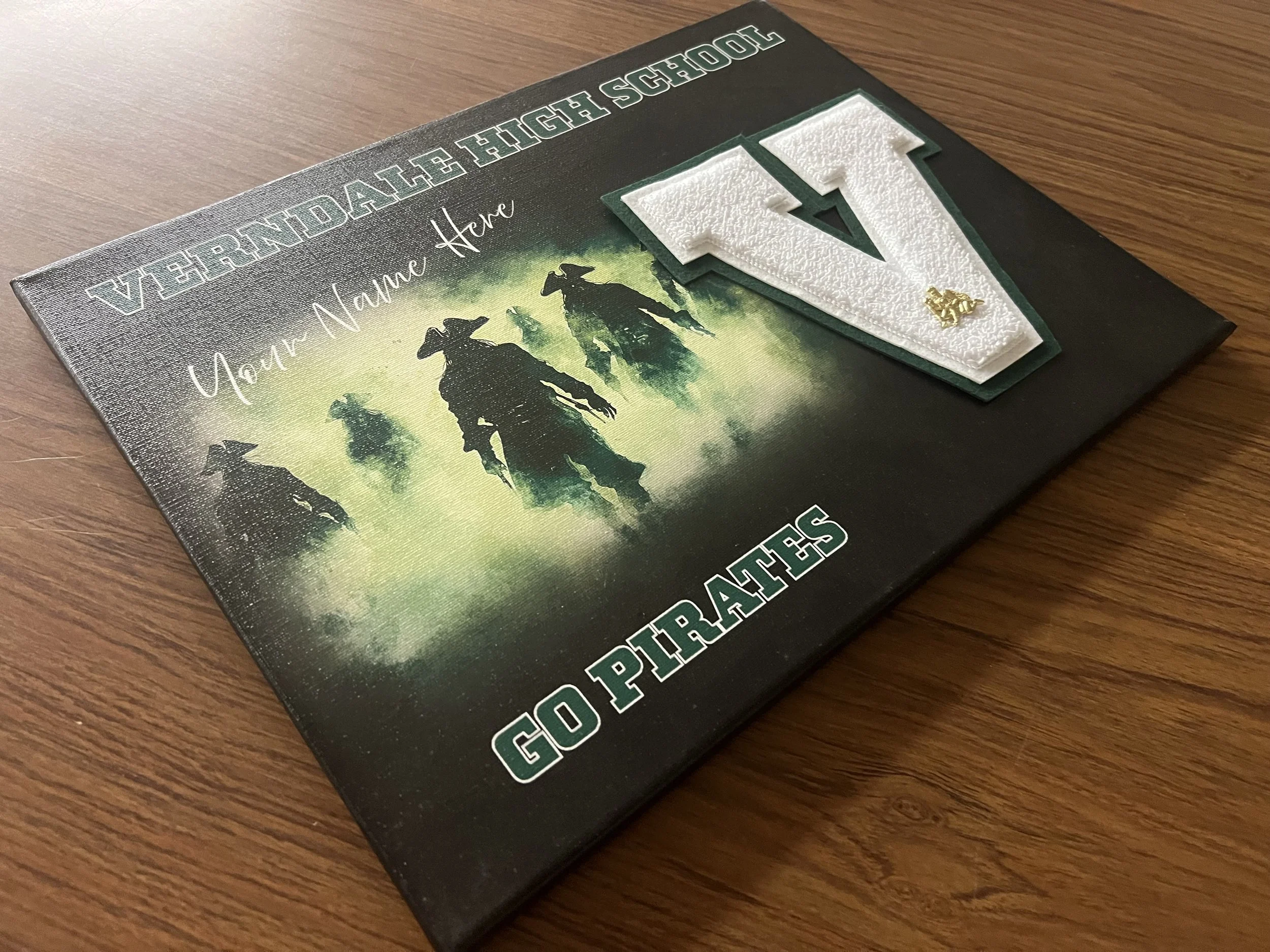 This high quality 12” x 16” Canvas Print is the perfect way to showcase your high school letter and achievements. Each print is custom printed and includes your name and school mascot just as shown. (Letter not included). Your letter pins push through the canvas with ease for a secure attachment. A fraction of the cost of a Letterman’s Jacket ($200-500!) the Plaque-it is a tremendous value.